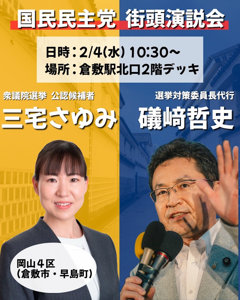 10:30 倉敷駅北口2階デッキ(応援弁士 礒﨑哲史先生)